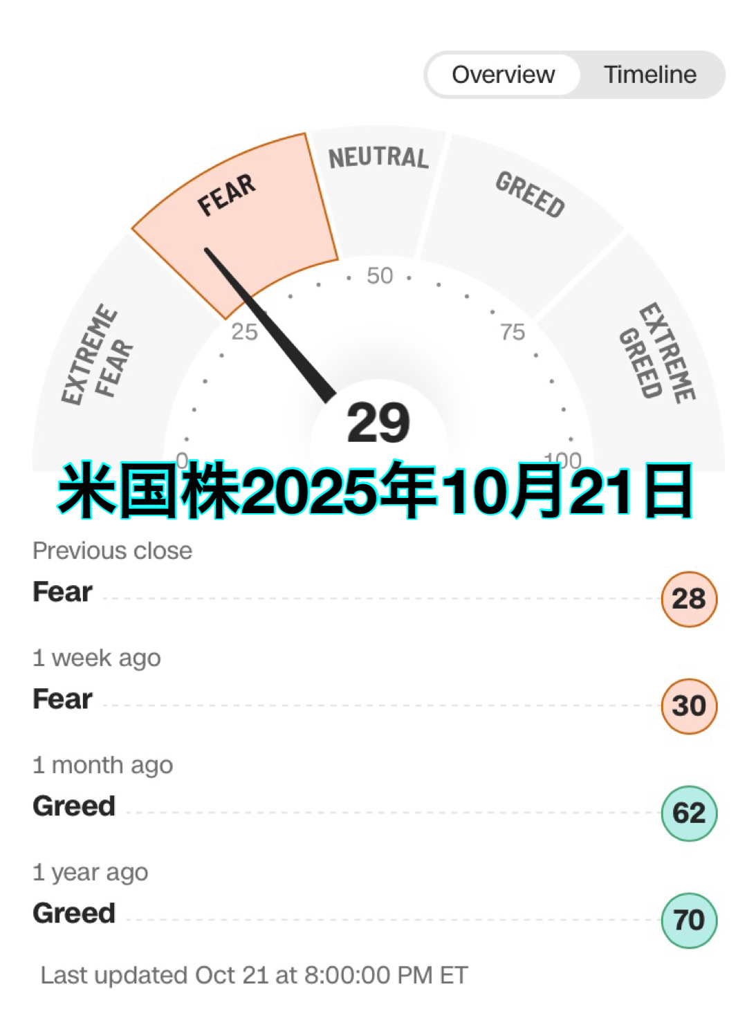 市場のボラティリティを示すVIX指数は17.88と低下し、投資家心理を示すFear & Greed Indexは29(Extreme Fearに近いFear)を示しています。