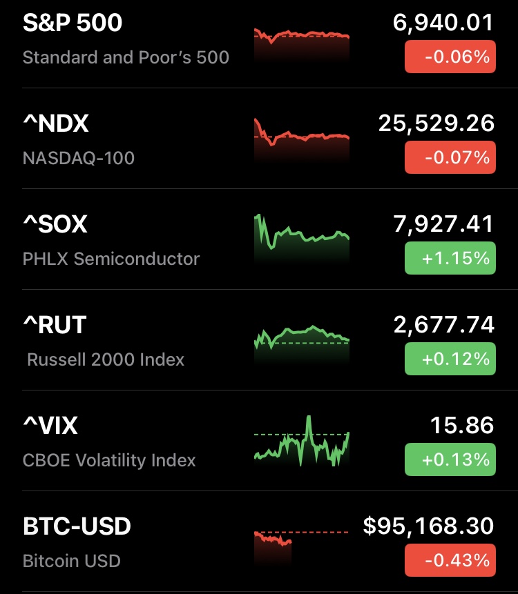 主要指数の終値は、ニューヨークダウが43,359ドル(-0.17%)、NASDAQが23,515ポイント(-0.06%)、S&P 500が6,940ポイント(-0.06%)でした。