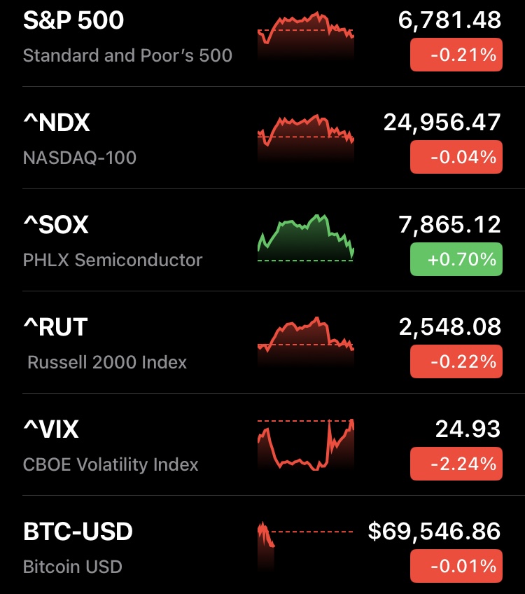 主要指数の終値は、ニューヨークダウが-0.07%、S&P 500が-0.21%と微減し、ナスダックは+0.01%とほぼ横ばいでした。